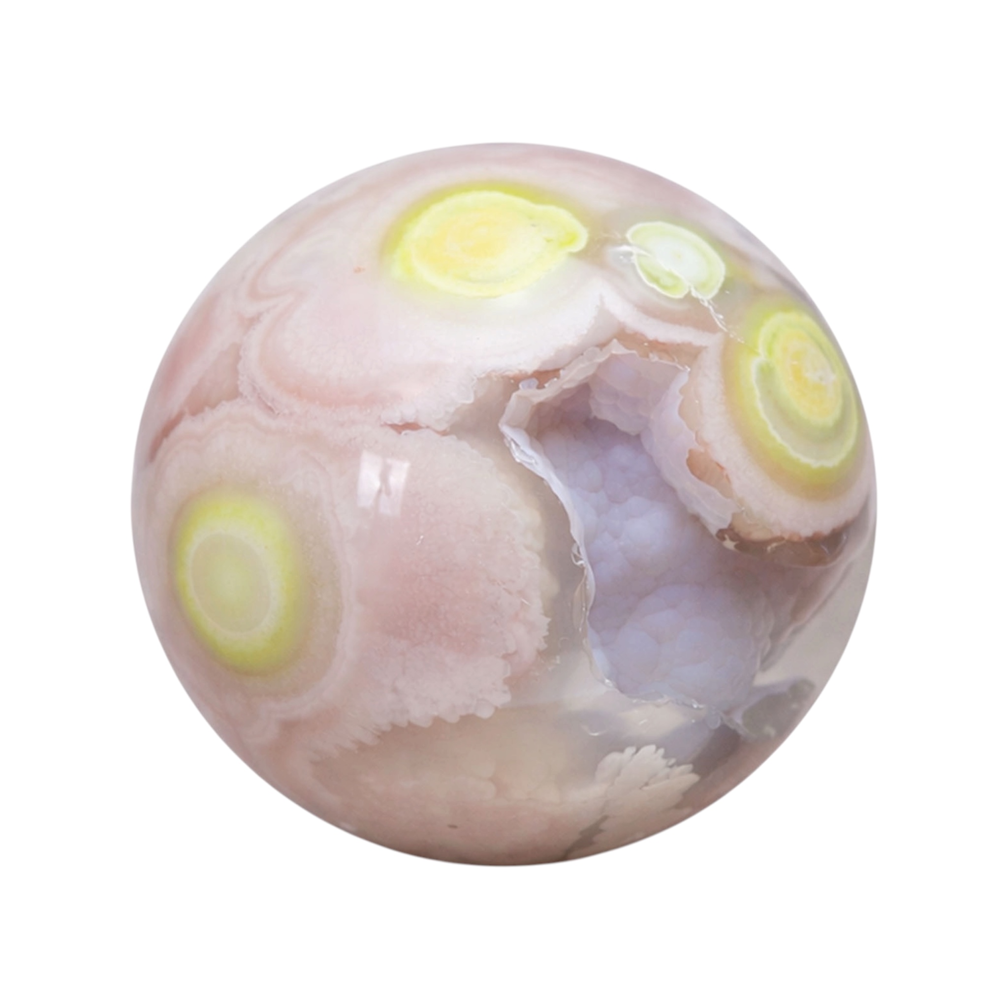 • Rare Botryoidal Formation: This sphere features a natural botryoidal (grape-like) structure inside the open cavity, formed by layers of chalcedony crystals that create a soft, sparkling texture.
