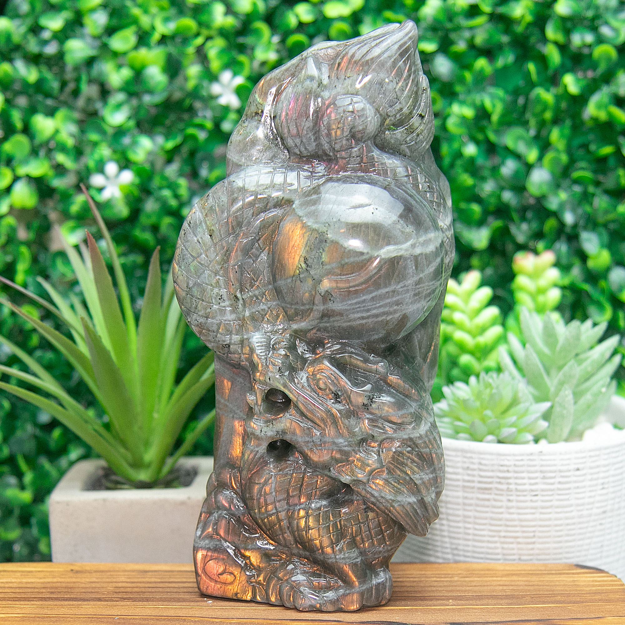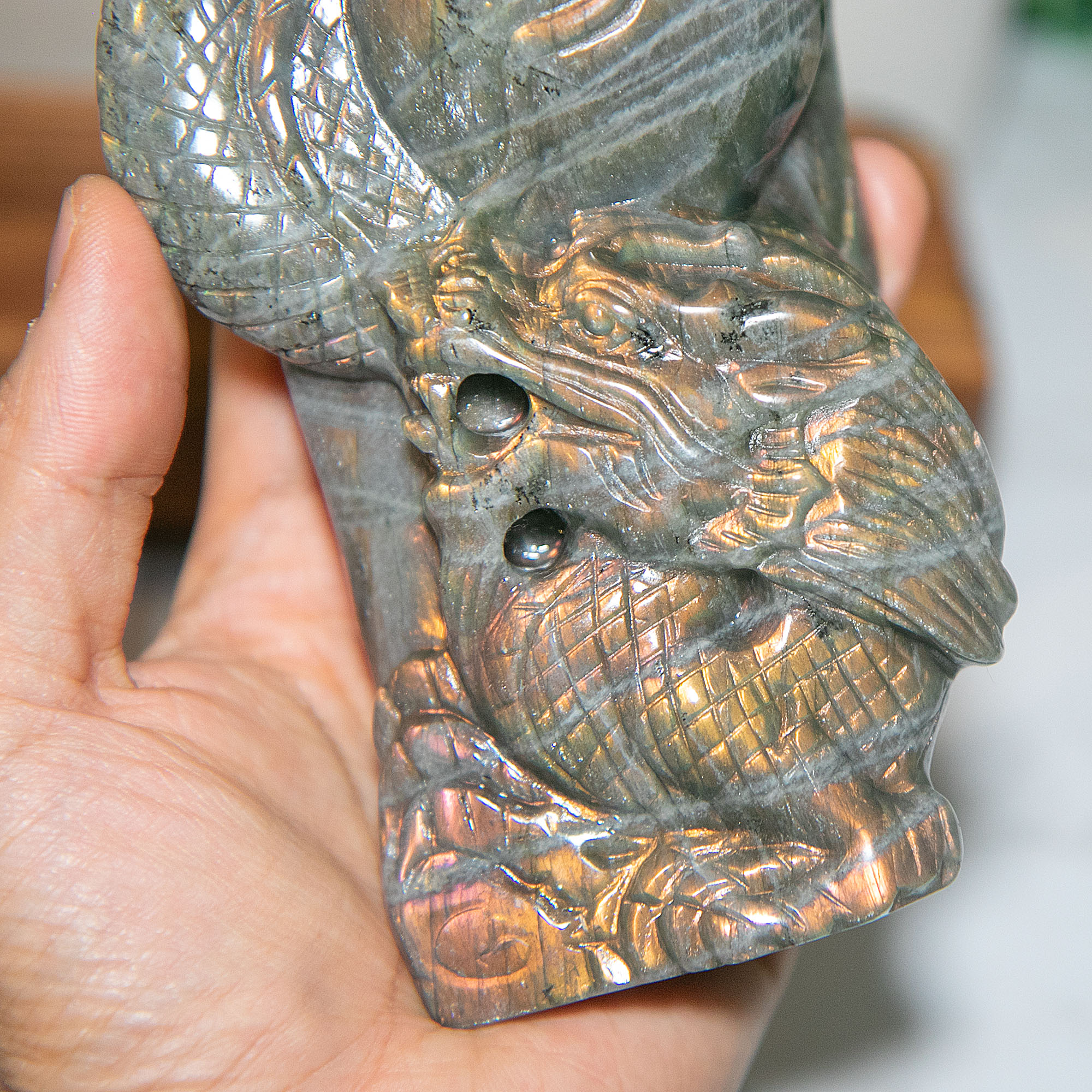 This magnificent Chinese dragon carving is hand-crafted from natural labradorite, a gemstone celebrated for its captivating flashes of iridescent color. With hues of gold, green, and blue shimmering across its surface, this piece radiates a mystical energy that shifts beautifully with the light.