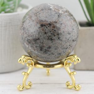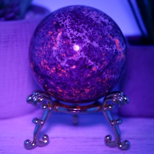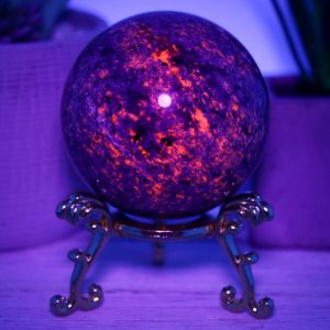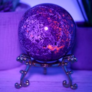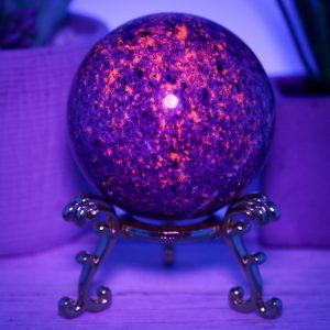The Yooperlite sphere is made from natural emberlite that has been hand-selected for its high quality and beauty. This gemstone is UV reactive, which glows under blacklight, adding extra excitement to this piece.