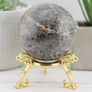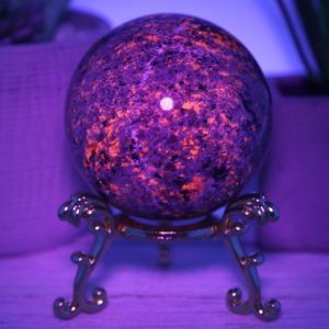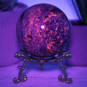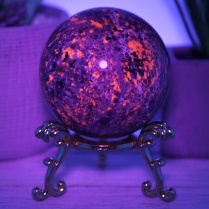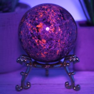 The Yooperlite sphere is made from natural emberlite that has been hand-selected for its high quality and beauty. This gemstone is UV reactive, which glows under blacklight, adding extra excitement to this piece.