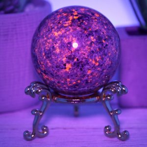 The Yooperlite sphere is made from natural emberlite that has been hand-selected for its high quality and beauty. This gemstone is UV reactive, which glows under blacklight, adding extra excitement to this piece.